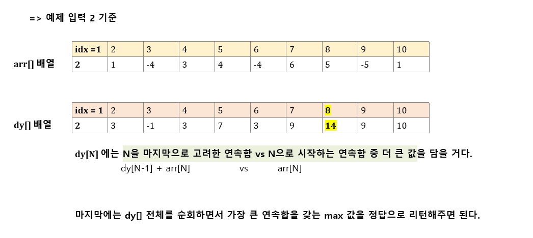 - dy[N] 점화식 : 1) 직전 합에 N을 마지막항으로 더한 합 2) N으로 시작하는 합 중에서 더 큰 값으로 세팅