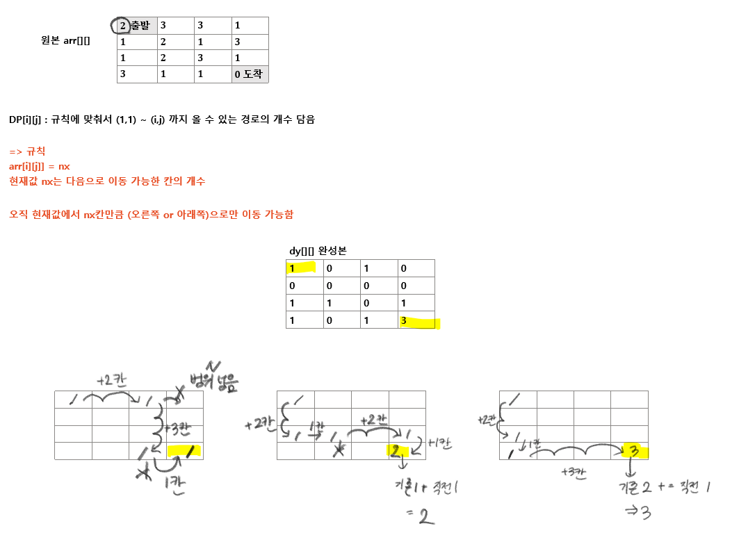 - 결과적으로 arr[i][j] 에 들어와있는 칸의 값 만큼 다음으로 이동할 수 있고, 그 방향은 오른쪽이거나 아래쪽만 가능하다고 되어 있다.