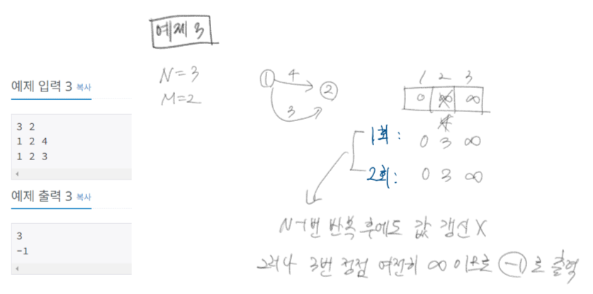 - 만약 1번 도시에서 출발해 어떤 도시로 가는 과정에서 시간을 무한히 오래 전으로 되돌릴 수 있다면 첫째 줄에 -1을 출력한다. (즉, 음수 사이클 존재하면 돌 때마다 값이 계속 줄어들 테니까 벨만 포드)