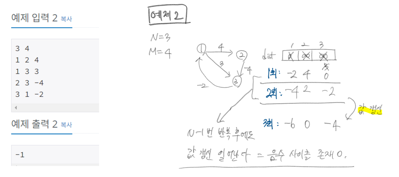 2) 이후 다시 모든 간선을 순회했을 때 갱신되는 값이 존재한다면