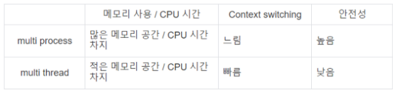 - 멀티 프로세스는 하나의 프로세스가 죽어도 다른 프로세스에 영향 주지 않아 안정성 높지만,
