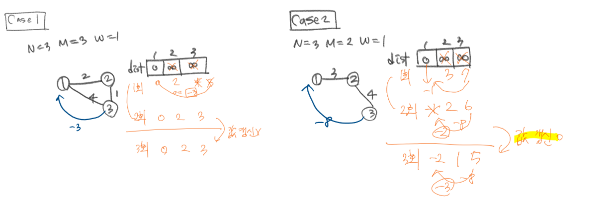 때는 2020년, 백준이는 월드나라의 한 국민이다. 월드나라에는 N개의 지점이 있고 N개의 지점 사이에는 M개의 도로와 W개의 웜홀이 있다. (단 도로는 방향이 없으며 웜홀은 방향이 있다.) 웜홀은 시작 위치에서 도착 위치로 가는 하나의 경로인데, 특이하게도 도착을 하게 되면 시작을 하였을 때보다 시간이 뒤로 가게 된다. 웜홀 내에서는 시계가 거꾸로 간다고 생각하여도 좋다.