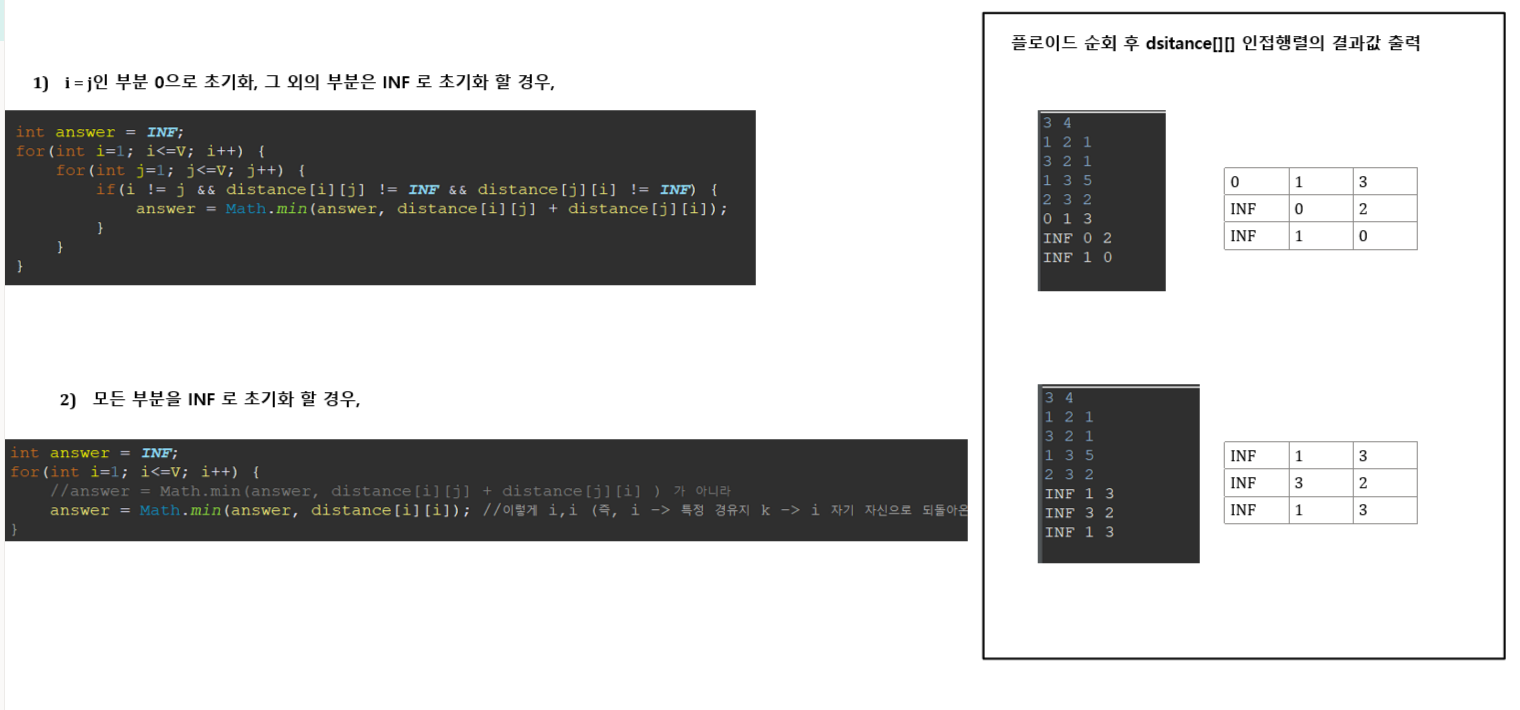 * distance[i][i] = i -> k -> i : 즉, 특정 경유지 k를 거쳐서 들어온 최단 거리를 저장하도록 함 (결과적으로는 사이클이 담김)
