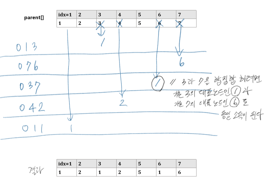 1) parent[] 1차원 배열 (자기 자신으로 초기화) : 이후 대표 노드가 담길 용도이다.