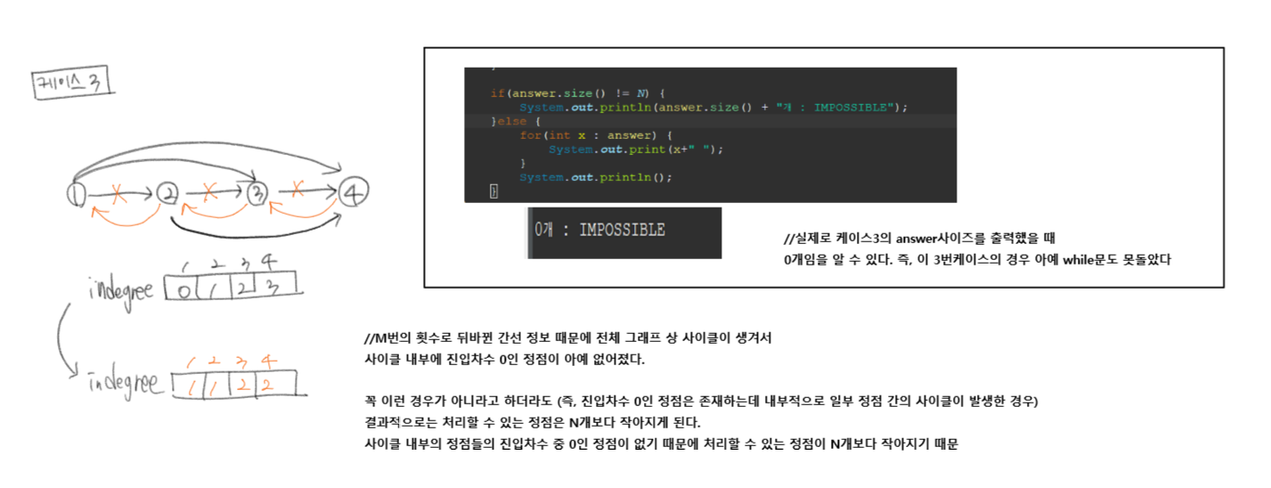 2) IMPOSSIBLE 출력 : 사이클 없는 위상정렬 수행 과정은 N번의 반복으로 끝나야 하는데, answer에 담긴 순서 size가 N개가 아니라면 사이클이 생겼다는 말이다. 위상 정렬 과정에서 사이클이 생긴 그래프를 순회하면 방문하는 정점의 수가 n개보다 작다. cycle을 이루는 내부의 정점들의 indegree가 0이 될 수 없기 때문에 Q에 담기지 못한다. 따라서 처리할 수 있는 정점이 N개 보다 작아지는 것이다.