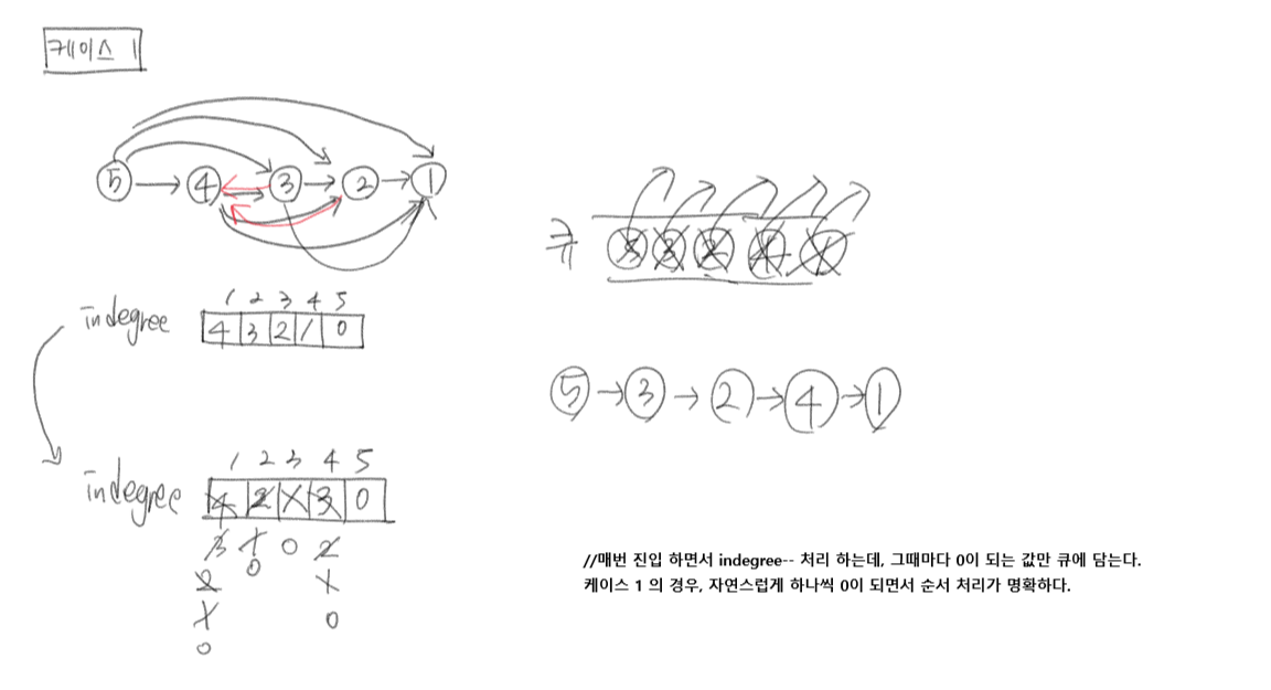 - 이 상태의 graph에 접근해서 위상 정렬을 수행할 때, 정상적으로 사이클 없이 순서 결정 가능한 위상 정렬 대상이라면 정확히 N번 동안 회전할 것이고, 순서를 확실하게 알 수 있는 경우는 매번 Queue에 담긴 size() == 1일 것이므로 위의 엣지 케이스를 처리해서 문제가 요구하는 대로 출력하는 것이 관건인 문제다. 이 아이디어를 잘 이해하고 다음에 잘 활용하자.