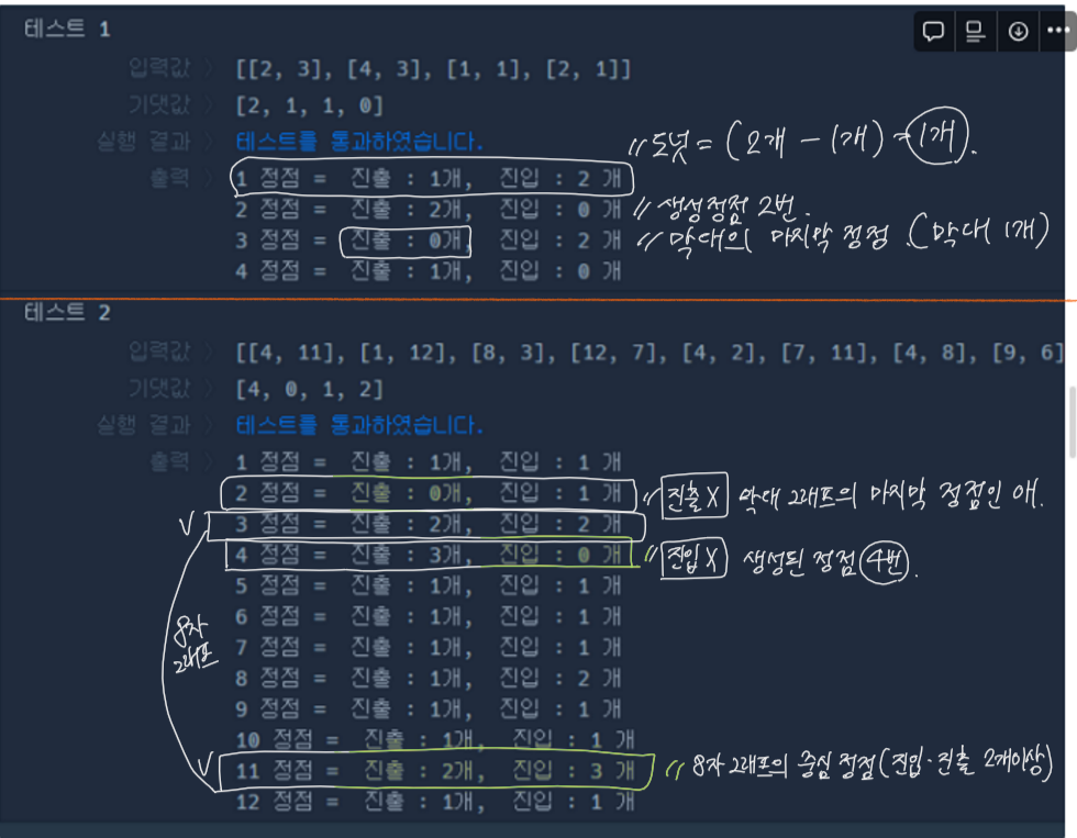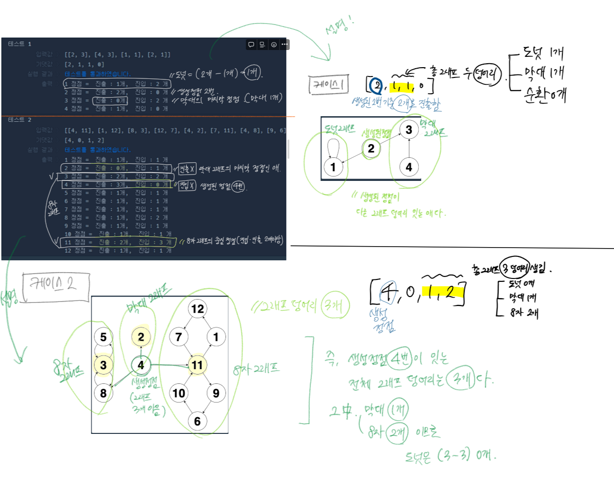 - 생성된 정점은 진입 X, 진출 2개 이상인 (그래프 덩어리 잇는 애) 이므로 답 세팅