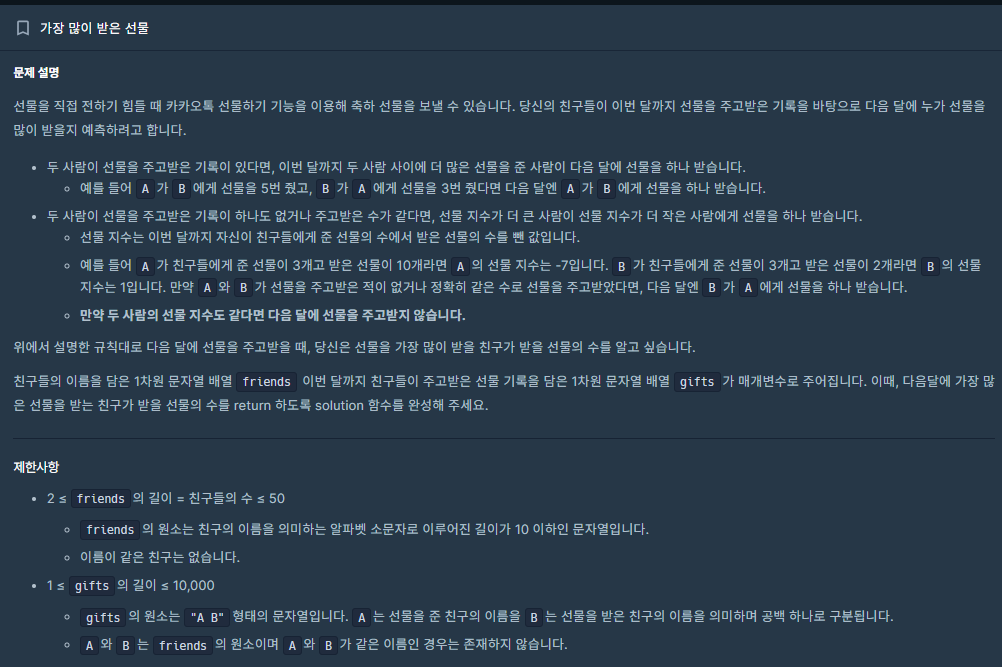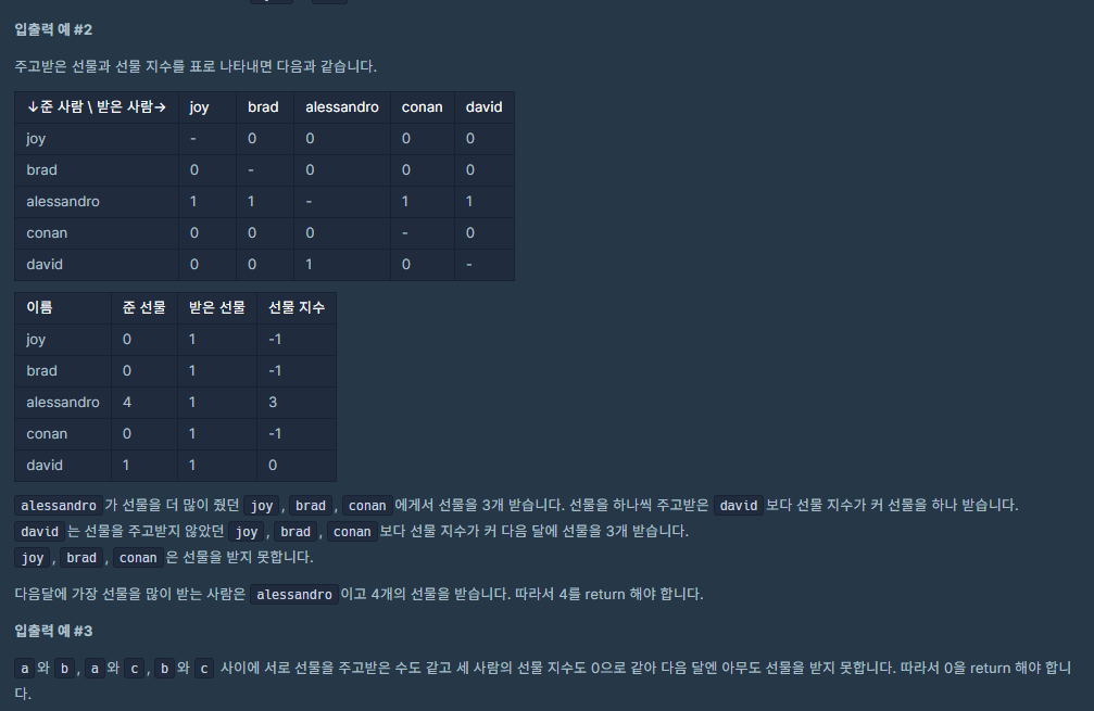 내가 해설지와 조금 다르게 접근한 부분이 있다면 카카오 기출 해설지에서는 현재 i 기준으로 다른 N-1명에게 모두 준 선물은 배열 i행의 합, N-1명에게 받은 선물은 배열 i열의 합으로 구하여 선물 지수를 구하라고 되어 있는데, 나 같은 경우에는 HashMap<Integer, Integer> 로 애당초 2차원 배열 세팅해줄 때, 선물 지수를 세팅해줬다. 나는 이게 더 편하다. 카카오 기출 해설지