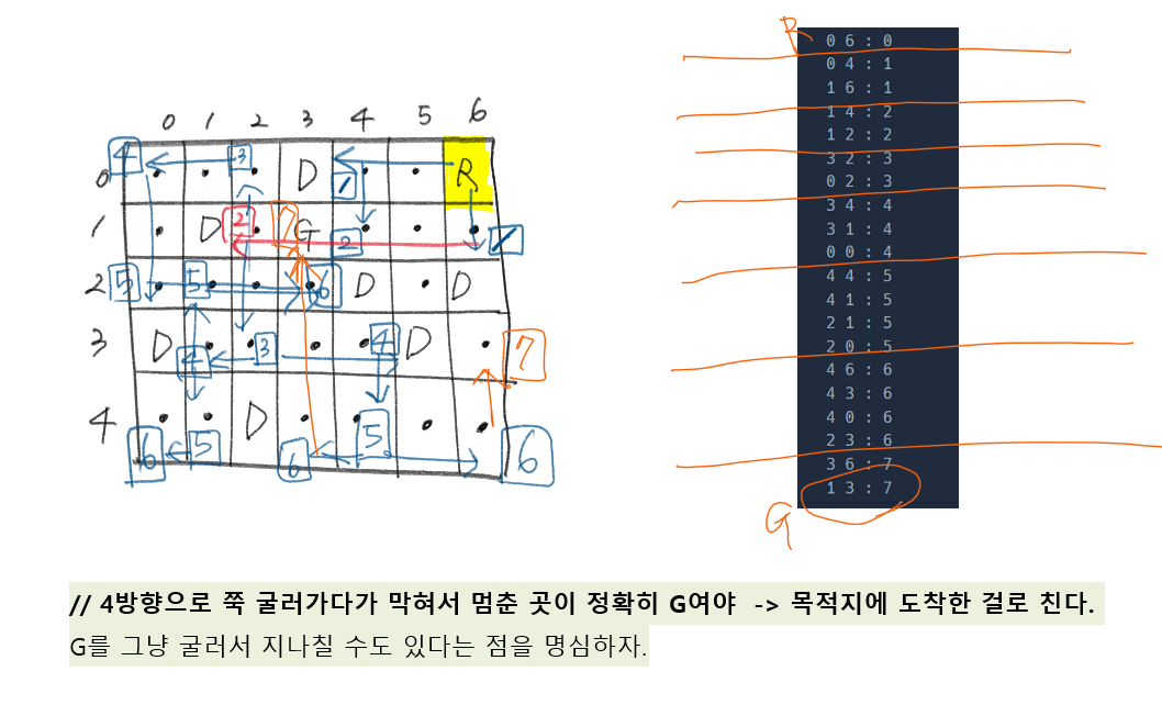 반드시 D든 맨끝이든 부딪혀서 쭉 가다 막혀서 (멈춘 위치가) G여야 목표점 도달이다.