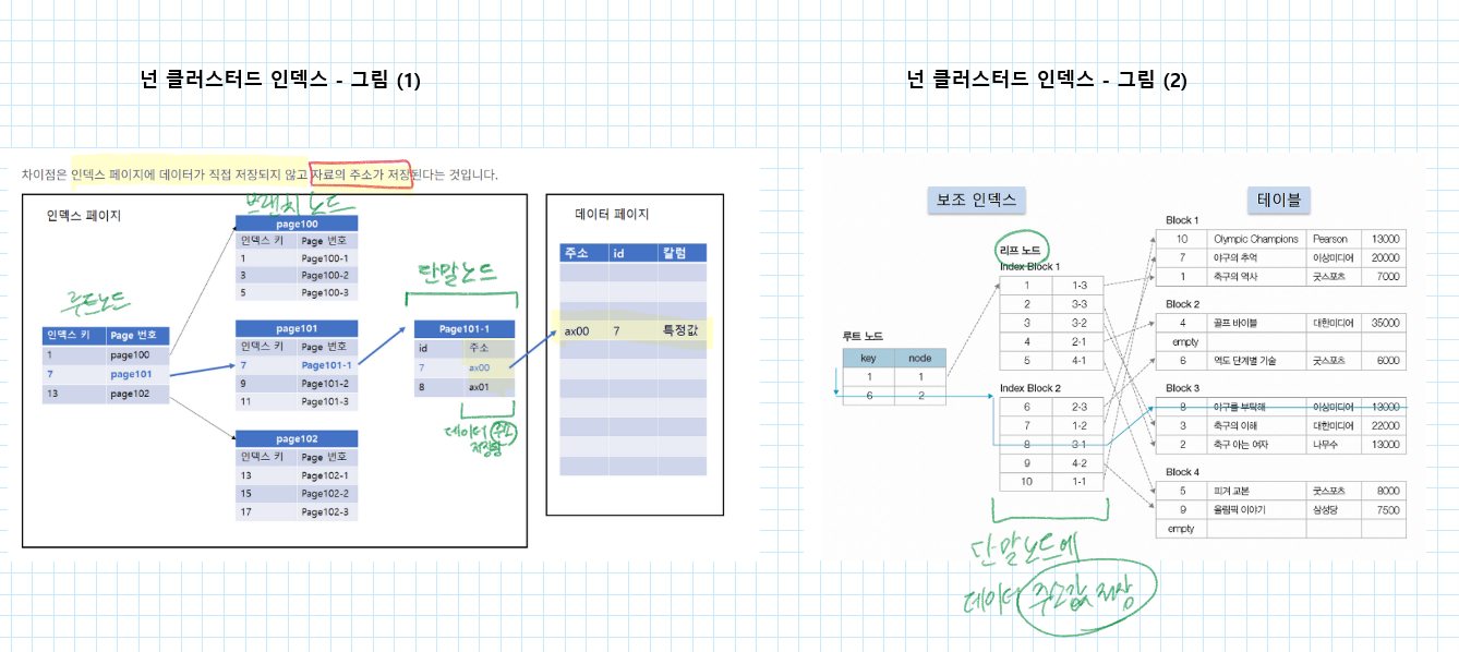 - 넌 클러스터형 인덱스(Non-clustered Index) : 책의 목차로 찾고자 하는 내용의 페이지 찾고, 그 페이지로 이동하는