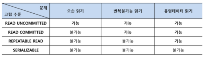 → 다음의 표는 고립 수준에 따른 [트랜잭션 동시 실행 문제] 발생 여부를 표현한 표이다.