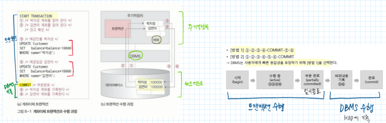 - 트랜잭션은 DB에 저장된 테이블을 읽어와서 주기억장치 버퍼에 저장해두고,