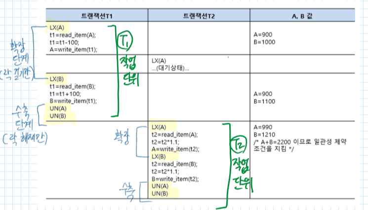 → 문제 원인 :T1이 A에 락을 걸고 작업하다가 (중간에 락을 해제시켜서) T2가 A에 접근 가능했기 때문이다.