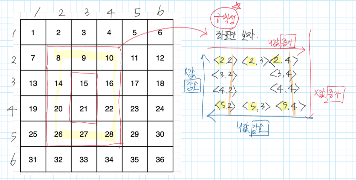 - 매번 쿼리로 들어오는 (x1, y1, x2, y2) 의 테두리만 돌아야 한다.