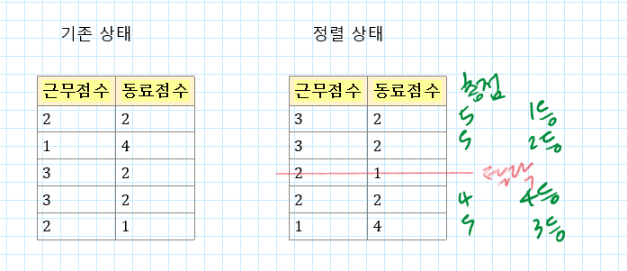 - 탈락 사원을 따지기 위해서는 근무태도에 대해서는 내림차순 정렬 하더라도, 동료평가 점수는 오름차순 정렬 해두어야 동료평가 점수마저 낮은 사람을 탈락시킬 때 용이하다.