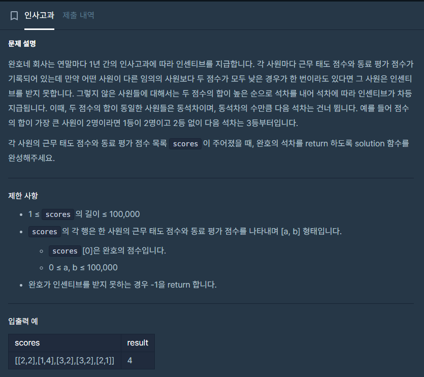 ⬛ 프로그래머스 | LV.3 인사고과 - 단순 구현 문풀 (Java)