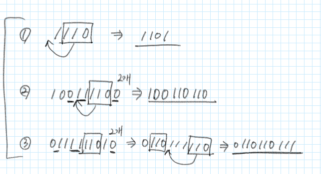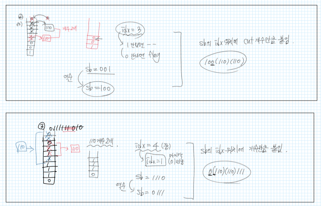 - 잘린 앞부분에 0이 존재O → indexLastOf()로 가장 마지막 0의 다음 위치에 “110”을 담기