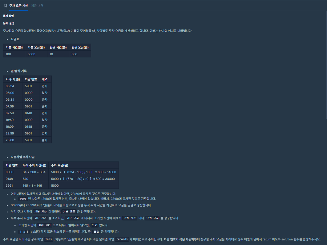 ⬛ 프로그래머스(카카오 기출) | LV.2 주차 요금 계산 - 단순 구현 문풀 https://school.programmers.co.kr/learn/courses/30/lessons/92341 프로그래머스 코드 중심의 개발자 채용. 스택 기반의 포지션 매칭. 프로그
