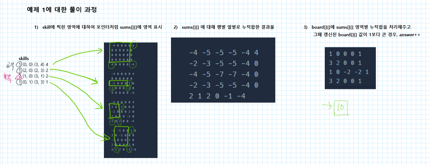 4) 구해놓은 sums[][] 누적합은 해당영역에 중첩되는 (공경 or 회복) 처리된 값이 누적되어 저장되어 있을 것이기 때문에 그 값을 board[][] 순회하면서 각 i, j에 맞는 값 더해주고, 갱신된 board 값이 1이상일 경우 answer++ 해주면 된다.