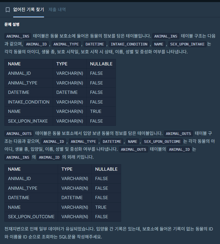 ⬛ 프로그래머스 | LV.3 없어진 기록 찾기 (MySQL)
