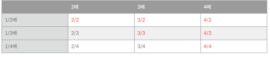 이때 중복 체크되는 것을 막기 위해서는 1보다 작은 분수 값만 활용한다. (위의 표는 1보다 큰 값만 활용함)