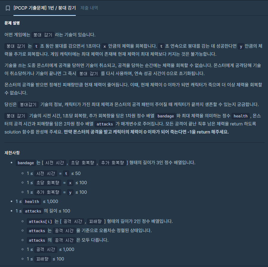 ⬛ 프로그래머스 (PCCP 기출) | LV.1 붕대 감기 - 단순 구현 문풀 (Java)