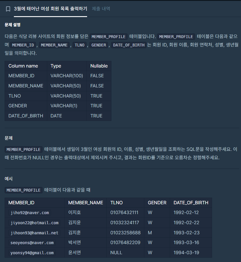 ⬛ 프로그래머스 | LV.2 3월에 태어난 여성 회원 목록 출력하기 (MySQL)