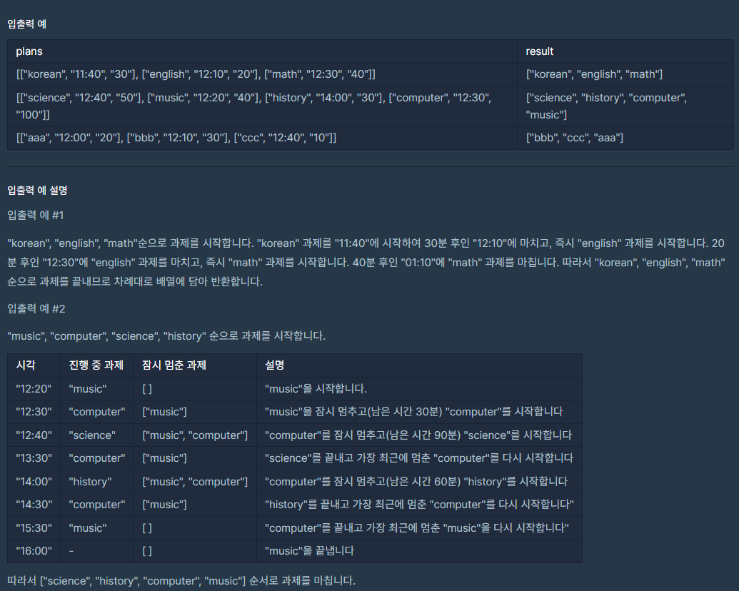 ⬛ 프로그래머스 | LV.2 과제 진행하기 - 구현 문풀 (Java)