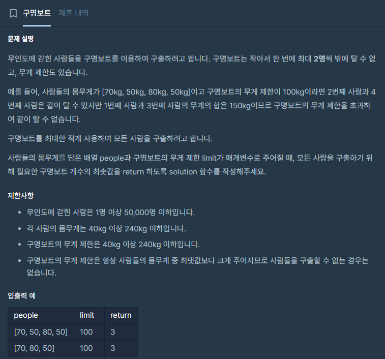 프로그래머스 | LV.2 구명보트 (그리디) https://school.programmers.co.kr/learn/courses/30/lessons/42885 프로그래머스 코드 중심의 개발자 채용. 스택 기반의 포지션 매칭. 프로그래머스의 개발자 맞춤형 프로필