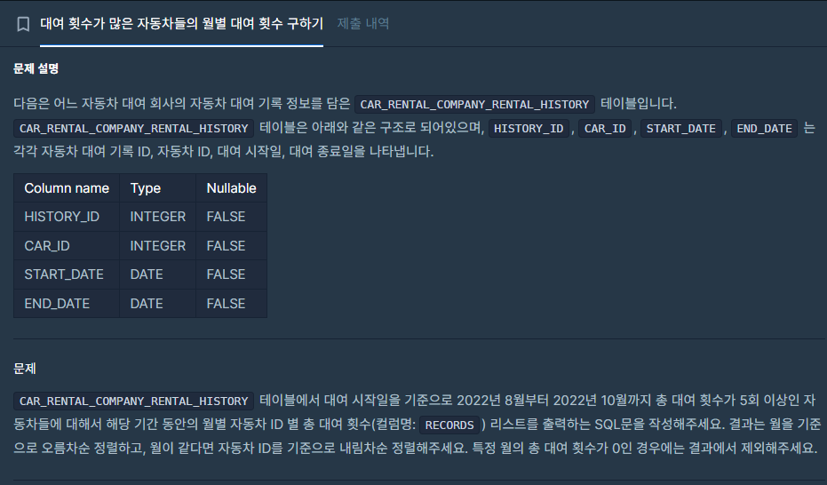 ⬛ 프로그래머스 | LV.3 대여 횟수가 많은 자동차들의 월별 대여 횟수 구하기 (MySQL)