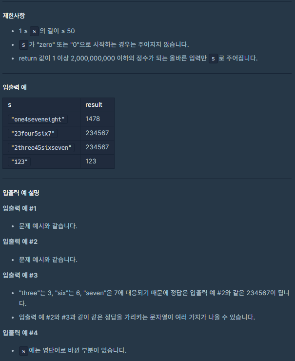 주어진 문자열에 존재하는 ‘영단어’ 문자열을 replace로 숫자값을 대체한 뒤, 마지막에 int형으로 변환시켜서 반환하면 되는 문제이다.